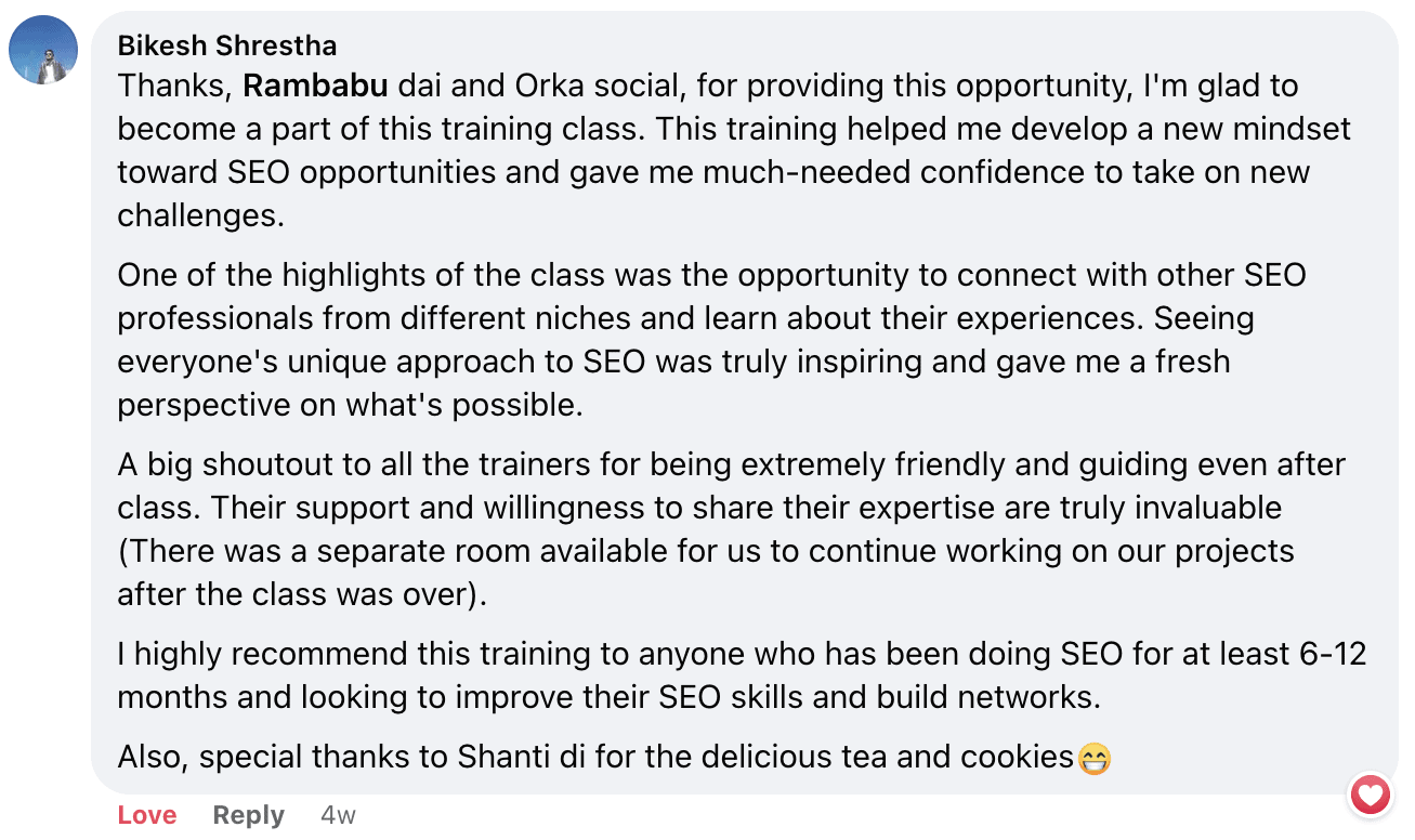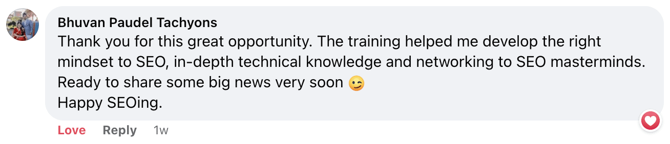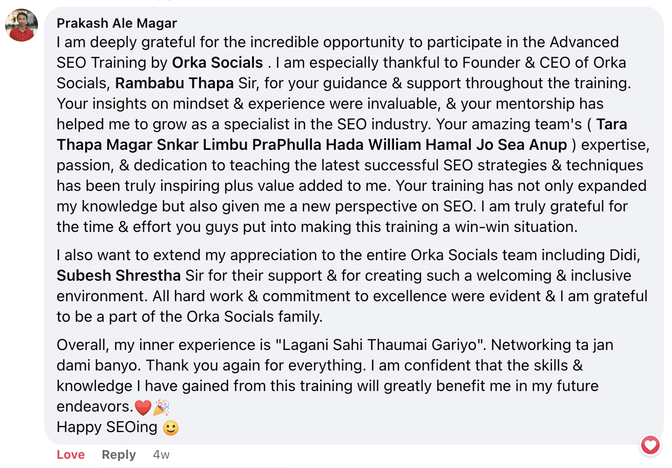Few of established SEO Experts from Nepal have participated in course have now started using our guides and checklists as a part of their standard operating procedure(SOP). Some are in the process of starting their own SEO Agency to scale their SEO service further.